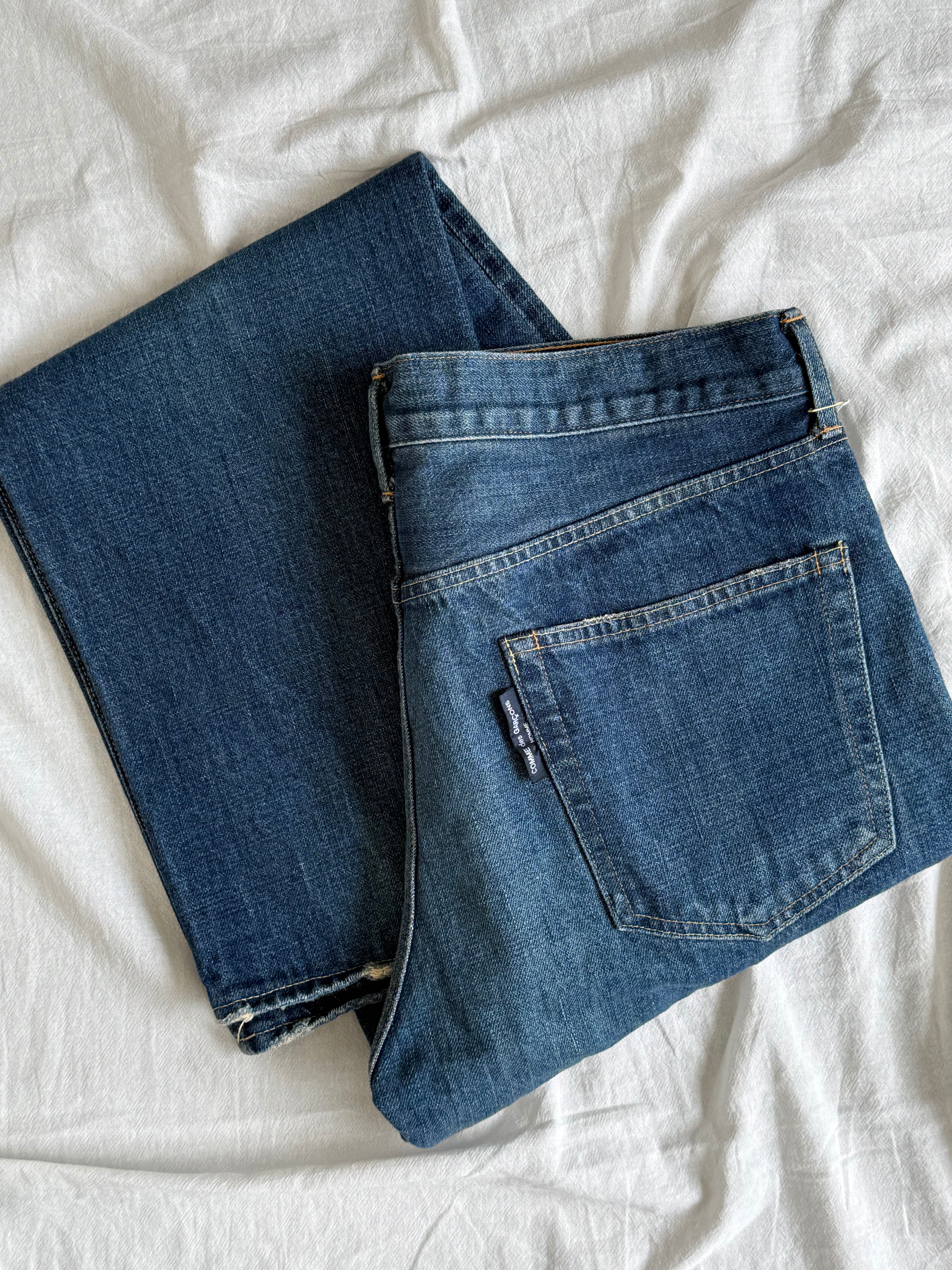 シンプルなデニムパンツ。ピスタグがなければブランドが分からない。それもまた乙。色落ちの加工やダメージ感が綺麗。