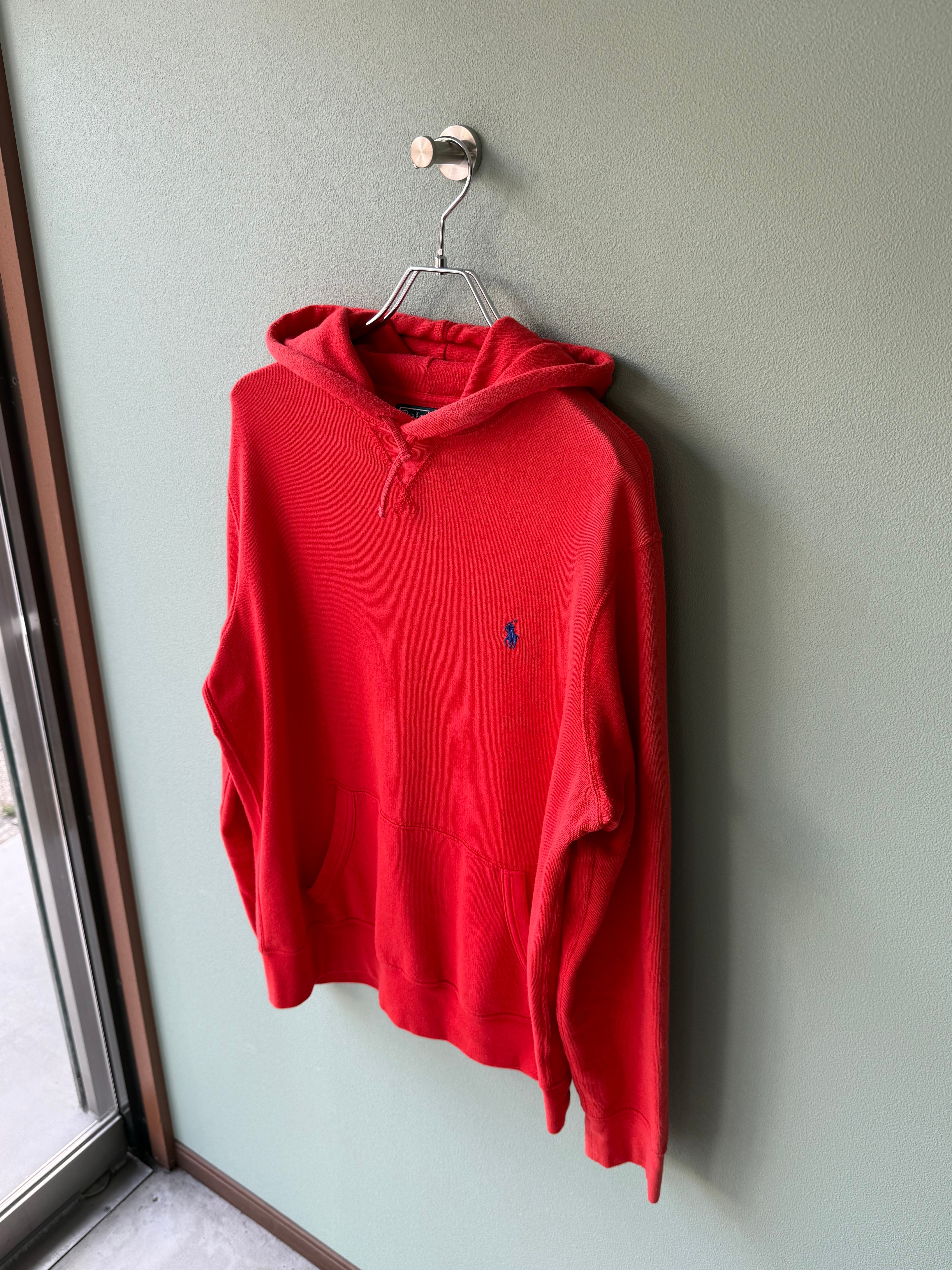 コットンポリのパーカー。発色が良く春らしい1枚。昨年あたりから全体的に赤が人気な気がしてます。